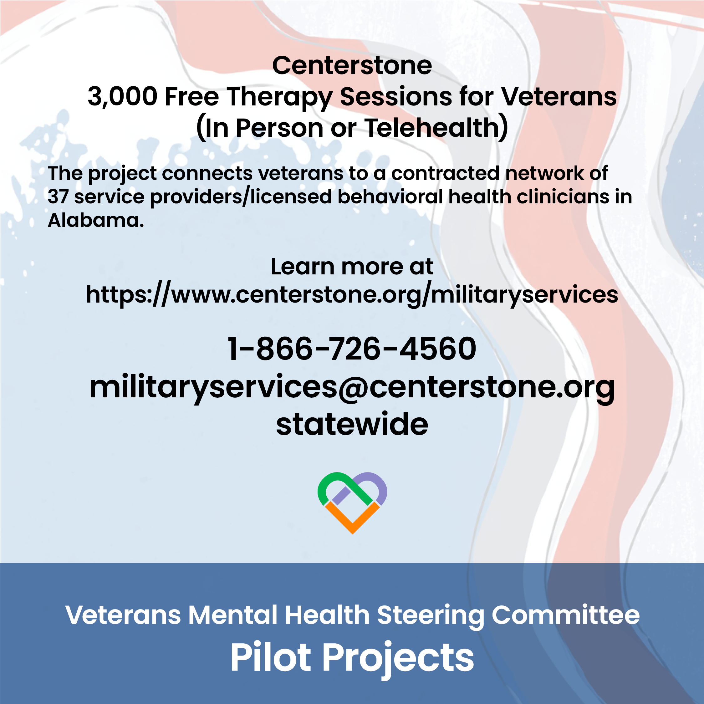 Centerstone – 3,000 Free Therapy Sessions for Veterans (In Person or Telehealth) www.centerstone.org/militaryservices or Call 1‑866-726-4560, or email militaryservices@centerstone.org