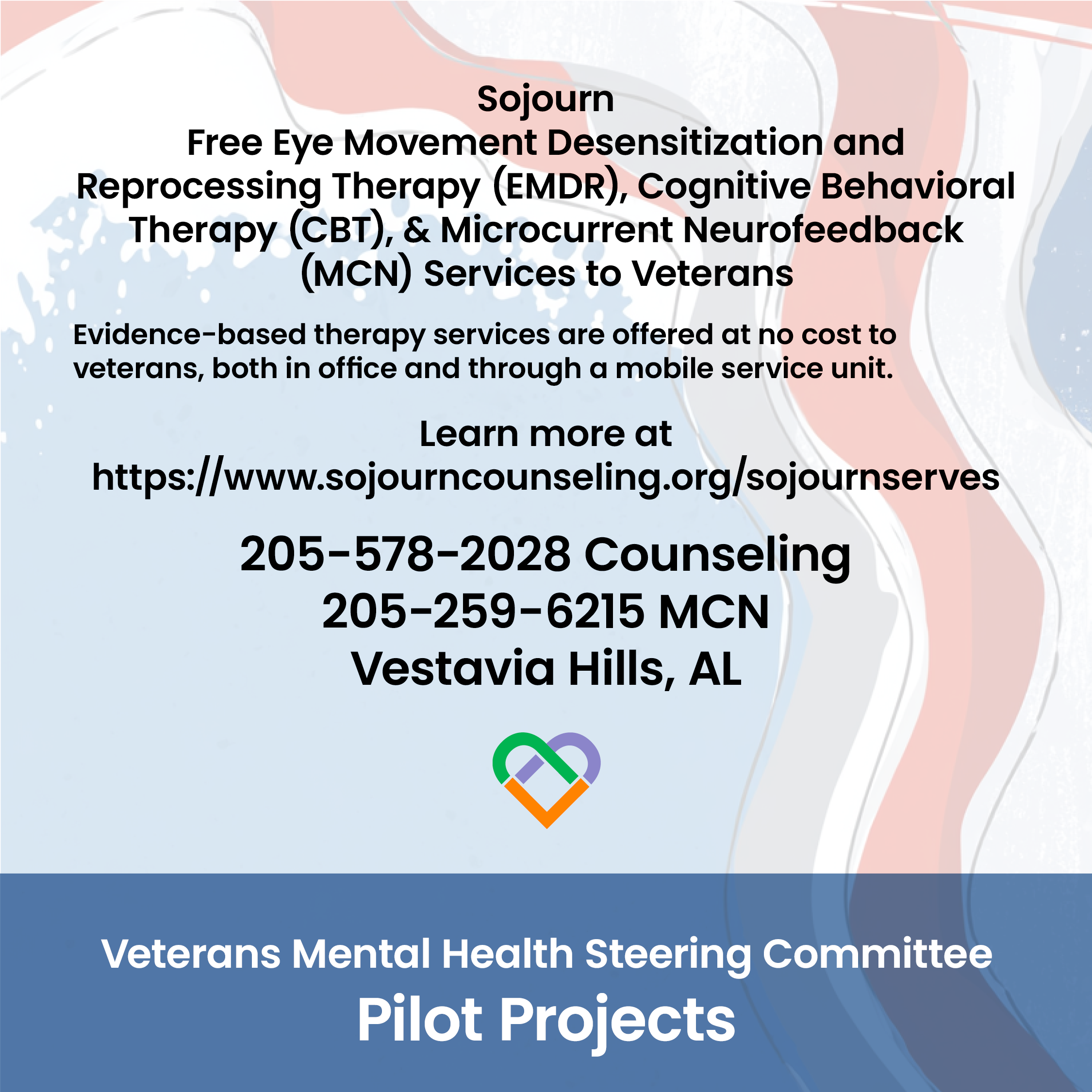 https://www.sojourncounseling.org/sojournserves or call 205-578-2028 for counseling; 205-259-6215 for Microcurrent Neurofeedback