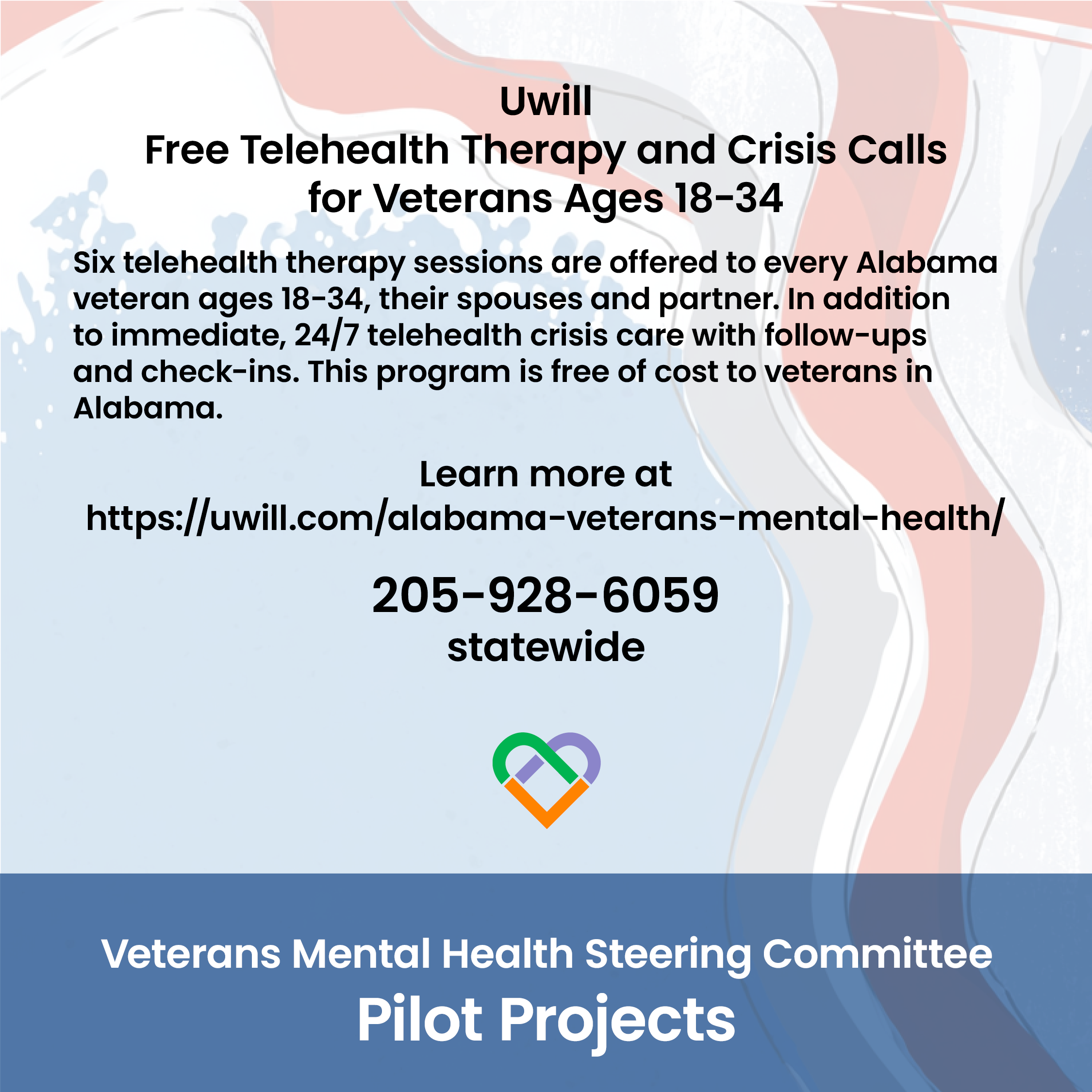 UWill – Free Telehealth Therapy and Crisis Calls for Veterans Ages 18-34 https://uwill.com/alabama-veterans-mental-health/ or call 205-928-6059